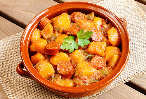 Patatas y zanahorias con salchicha en salsa de queso y hierbas